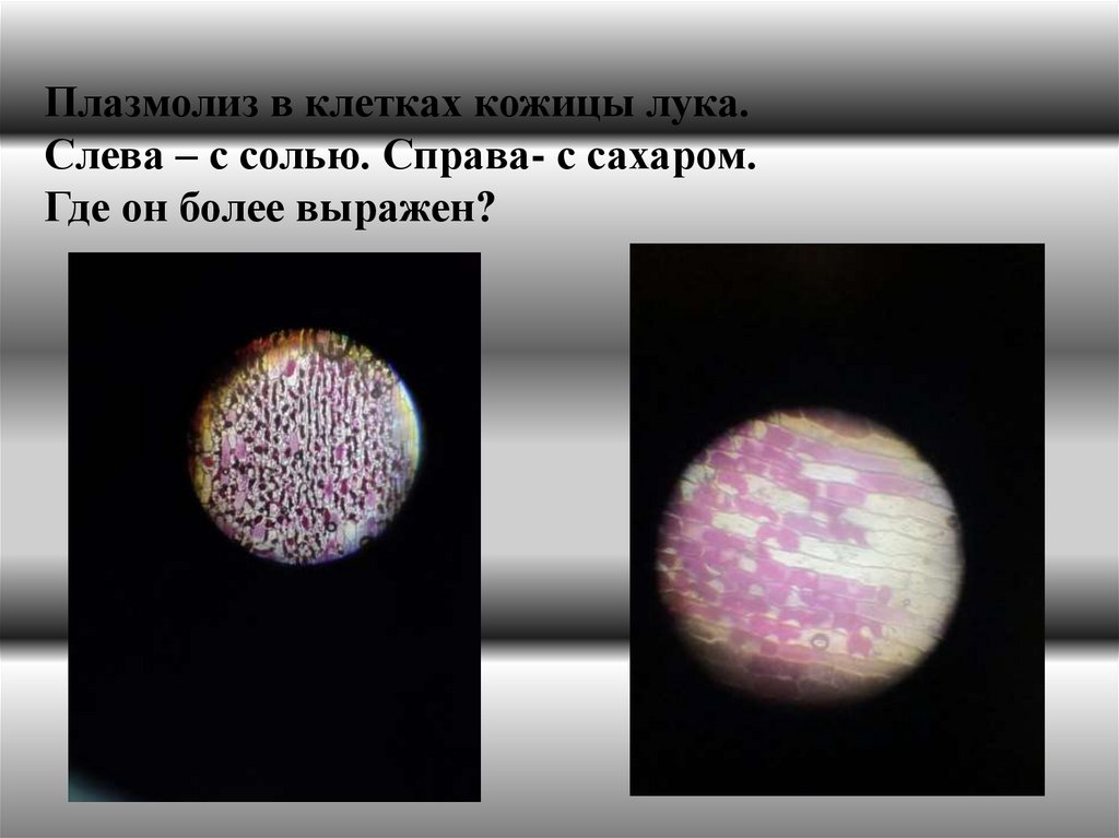 Плазмолиз в клетках кожицы лука.Слева – с солью. Справа- с сахаром.