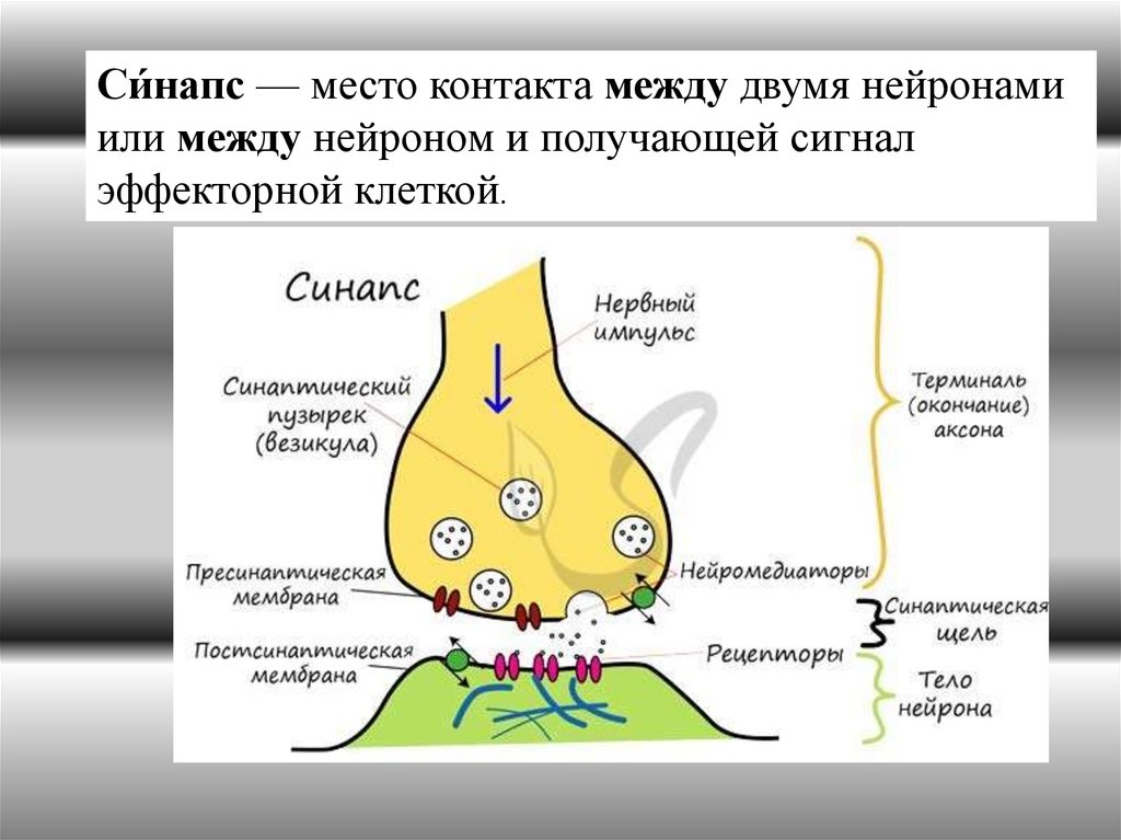Си́напс — место контакта между двумя нейронамиили между нейроном и получающей сигнал