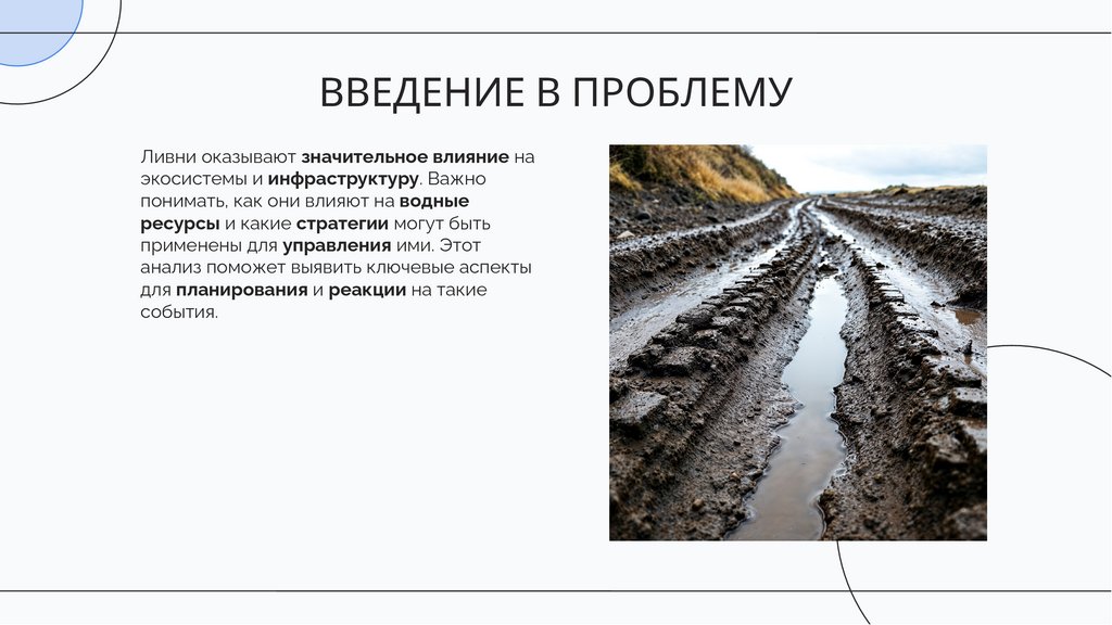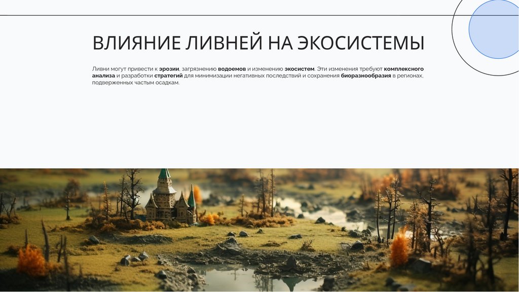ВЛИЯНИЕ ЛИВНЕЙ НА ЭКОСИСТЕМЫЛивни могут привести к эрозии, загрязнению водоемов и изменению экосистем. Эти изменения требуют комплексного