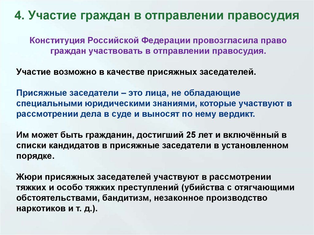 4. Присяжные заседатели могут участвовать в рассмотрении