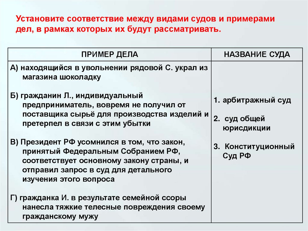 Установите соответствие между видами судов и примерамидел, в рамках которых их будут рассматривать.