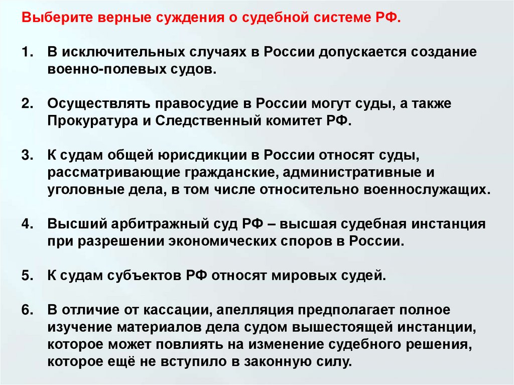 Выберите верные суждения о судебной системе РФ.1. В исключительных случаях в России допускается создание