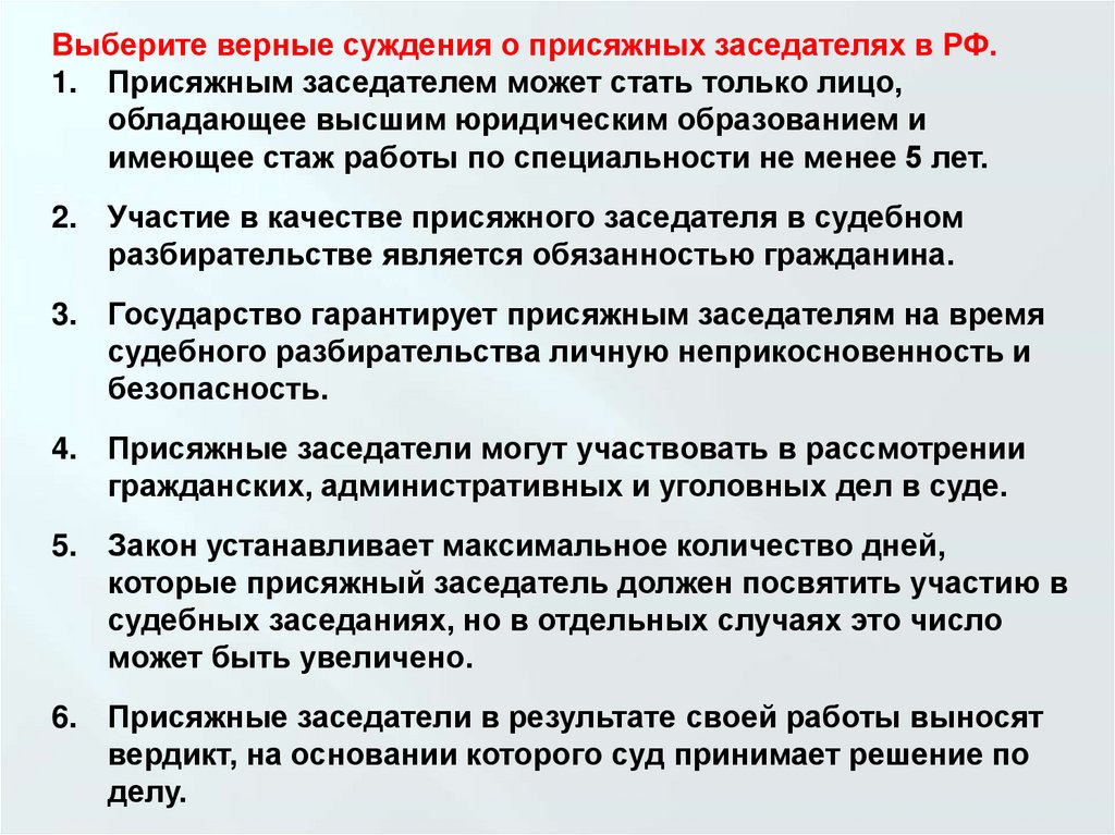 Выберите верные суждения о присяжных заседателях в РФ.1. Присяжным заседателем может стать только лицо,
