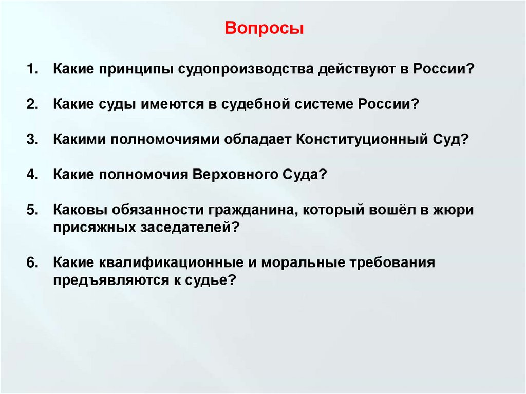 Вопросы1. Какие принципы судопроизводства действуют в России?