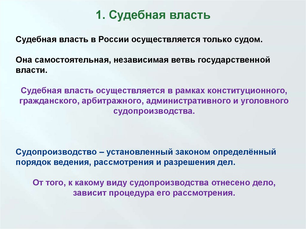 1. Судебная властьСудебная власть в России осуществляется только судом.