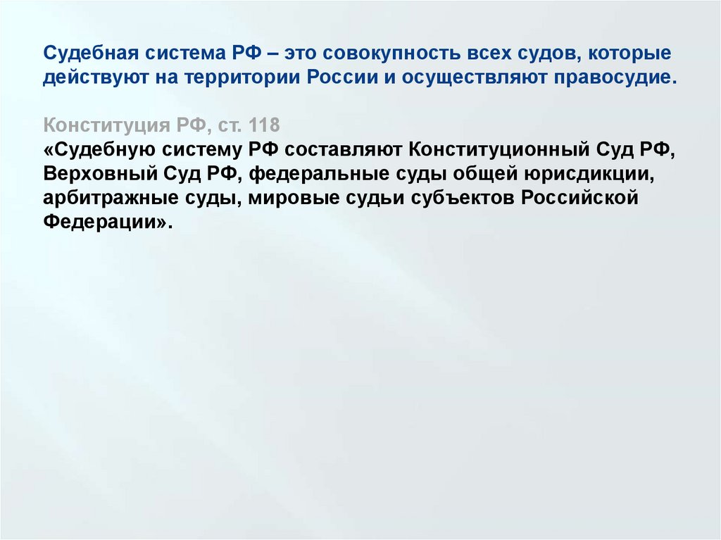 Судебная система РФ – это совокупность всех судов, которыедействуют на территории России и осуществляют правосудие.