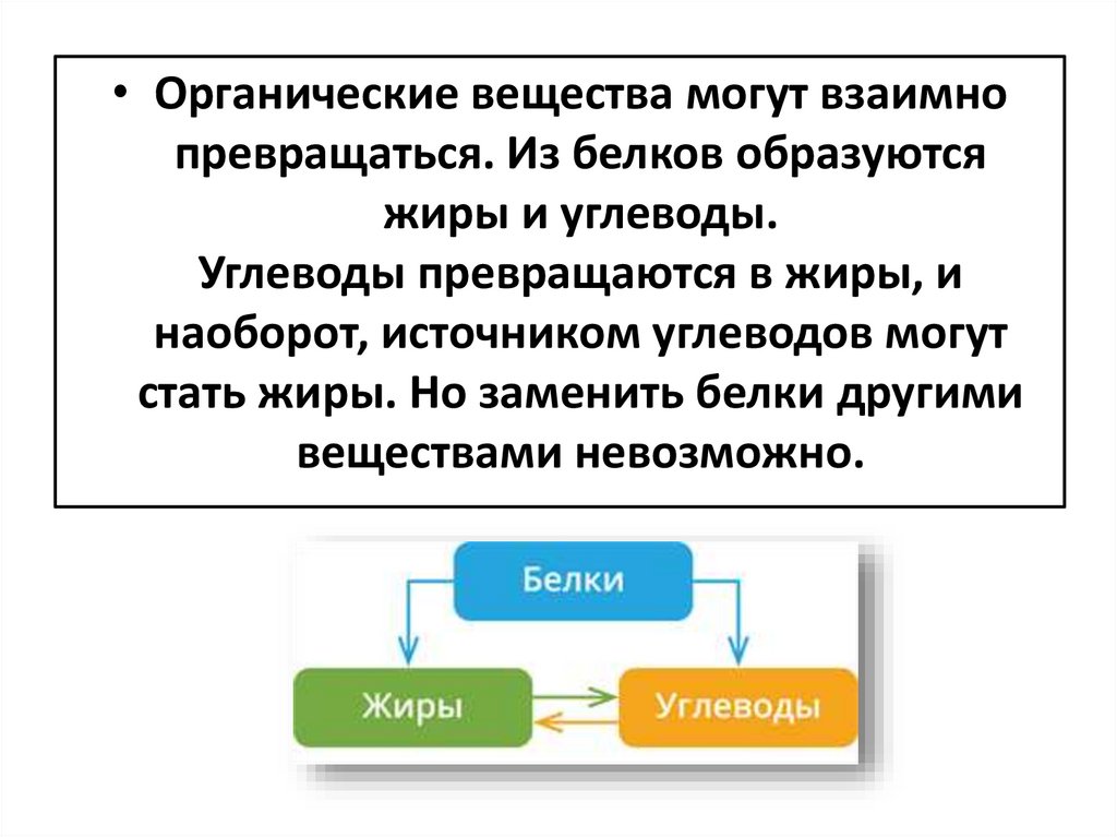 • Органические вещества могут взаимнопревращаться. Из белков образуются