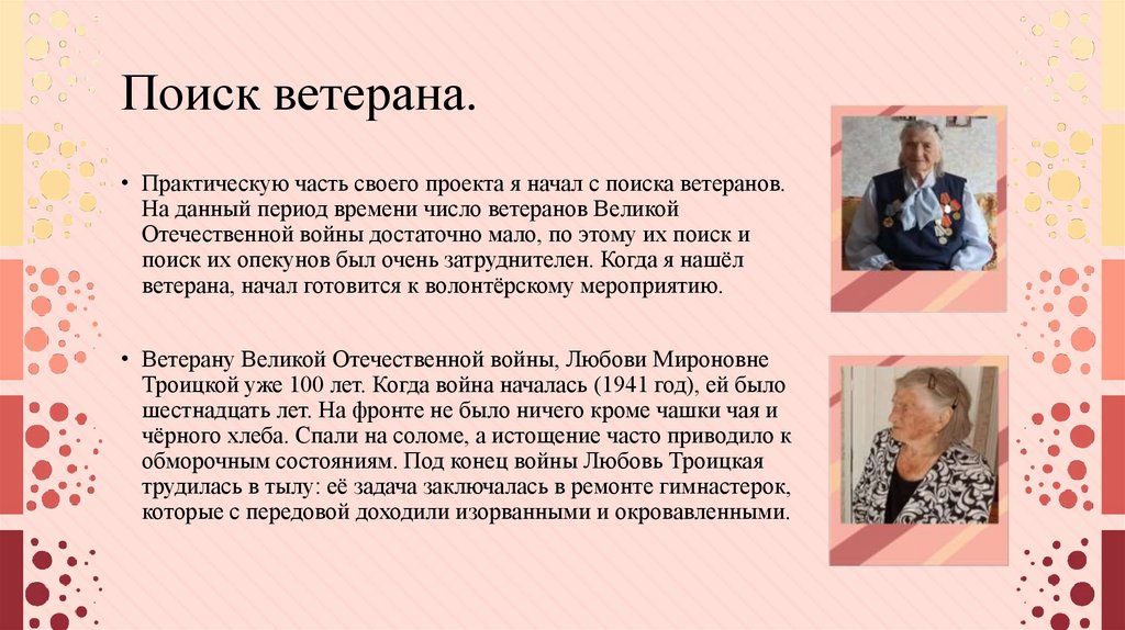 Поиск ветерана.• Практическую часть своего проекта я начал с поиска ветеранов.