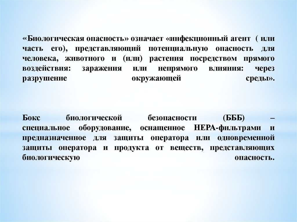 Биологическая опасность» означает «инфекционный агент ( иличасть его), представляющий потенциальную опасность для