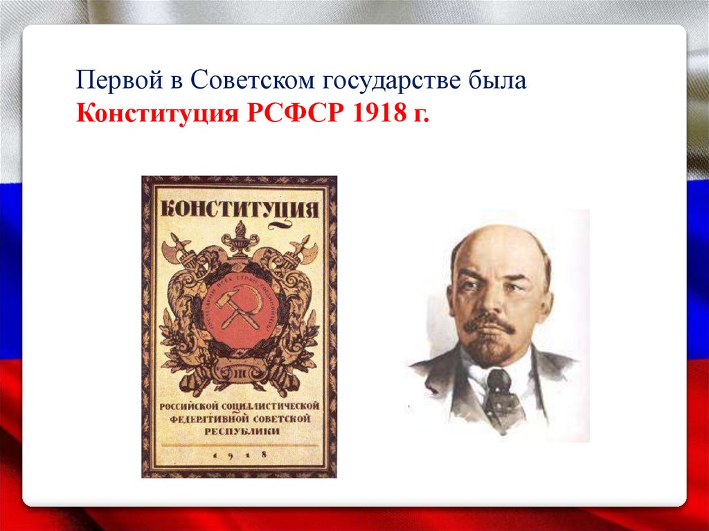Первой в Советском государстве былаКонституция РСФСР 1918 г.