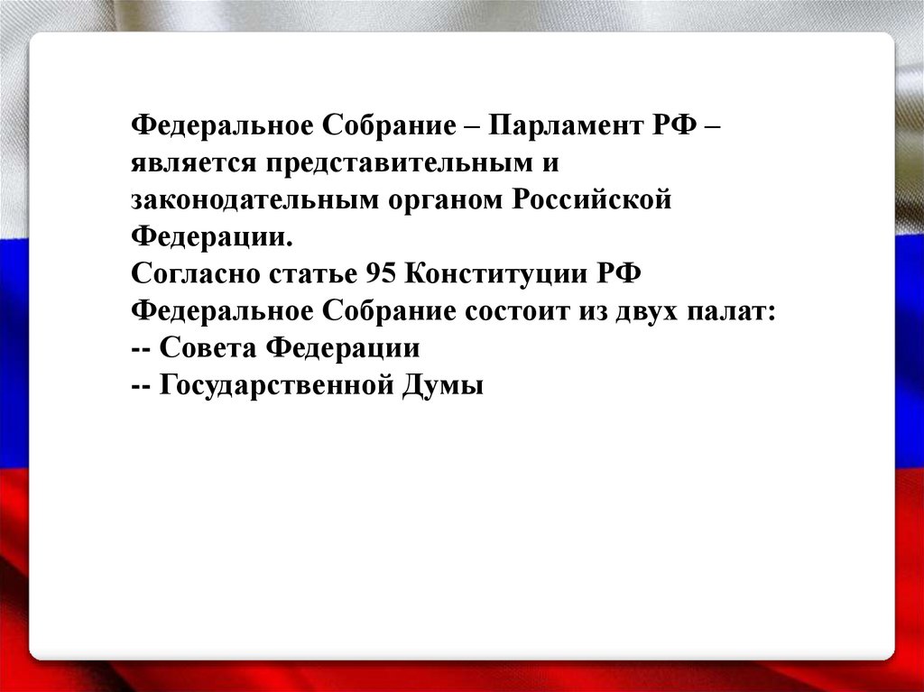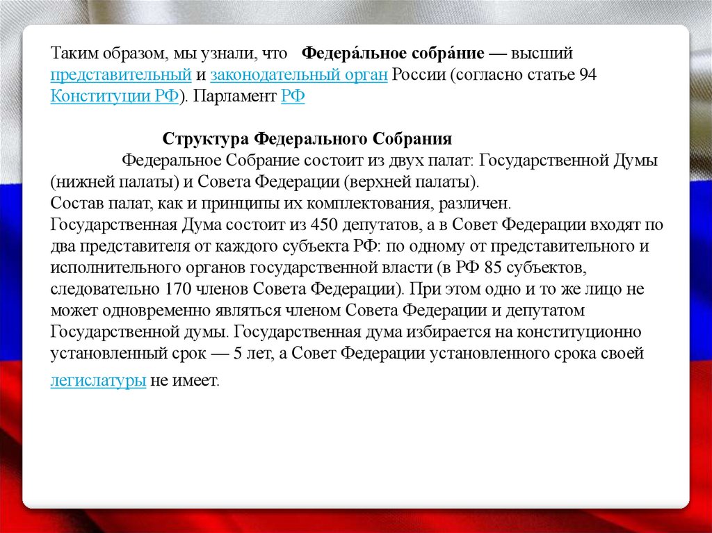 Таким образом, мы узнали, что Федера́льное собра́ние — высшийпредставительный и законодательный орган России (согласно статье 94