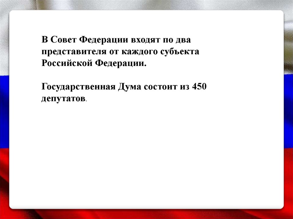 Государственная Дума состоит из 450 депутатов, а в Совет Федерации входят по