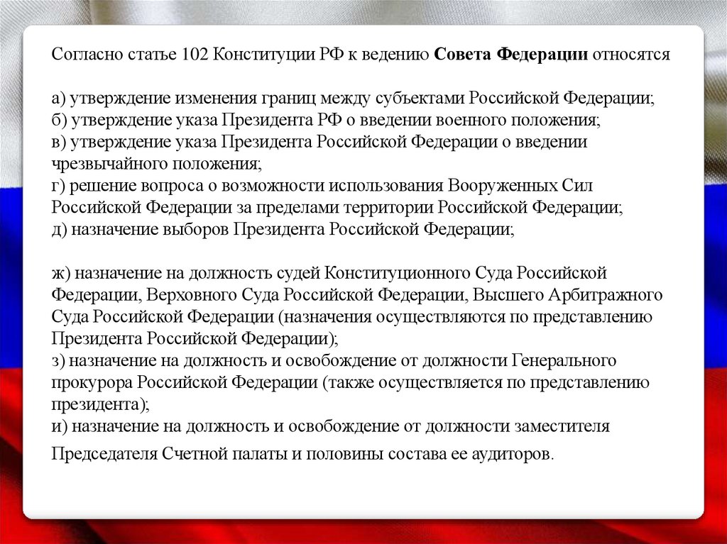 Согласно статье 102 Конституции РФ к ведению Совета Федерации относятсяа) утверждение изменения границ между субъектами Российской Федерации;