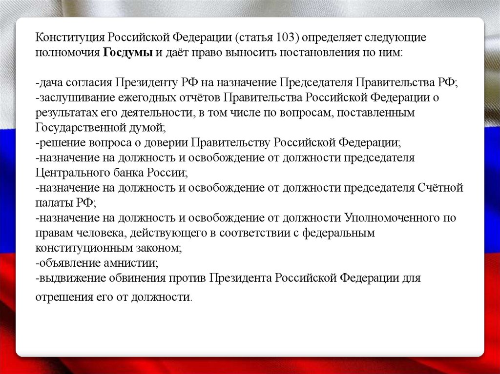 Конституция Российской Федерации (статья 103) определяет следующиеполномочия Госдумы и даёт право выносить постановления по ним: