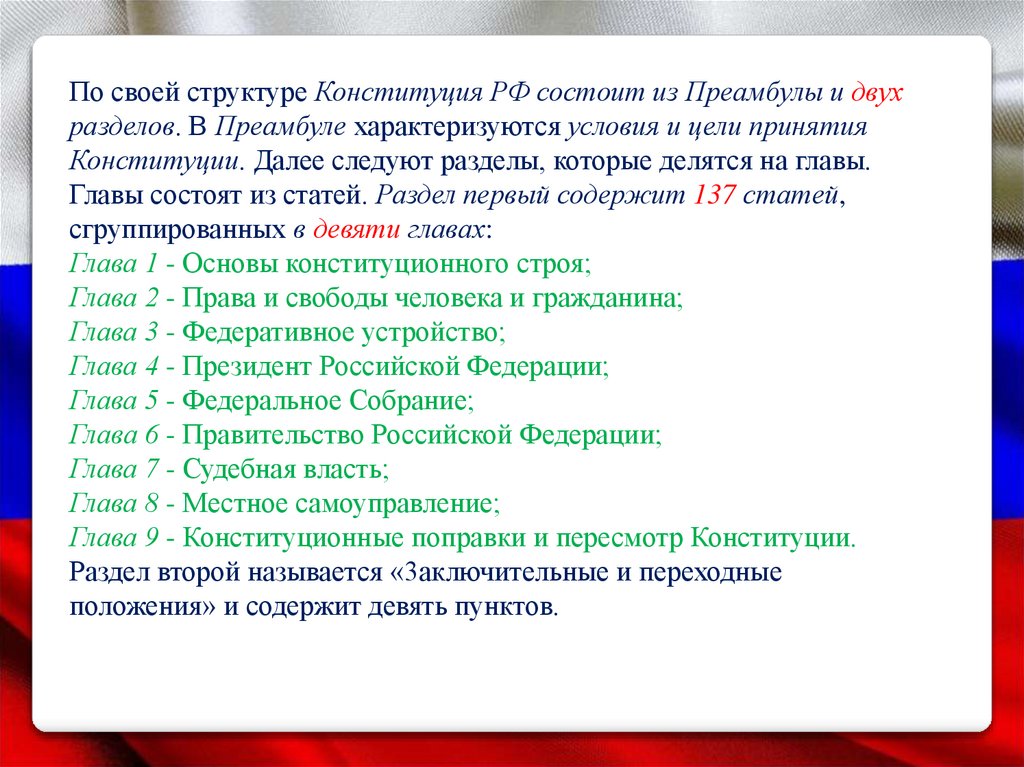 По своей структуре Конституция РФ состоит из Преамбулы и двухразделов. В Преамбуле характеризуются условия и цели принятия