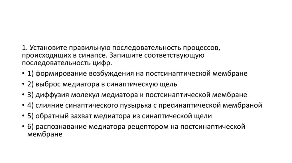 1. Установите правильную последовательность процессов,происходящих в синапсе. Запишите соответствующую