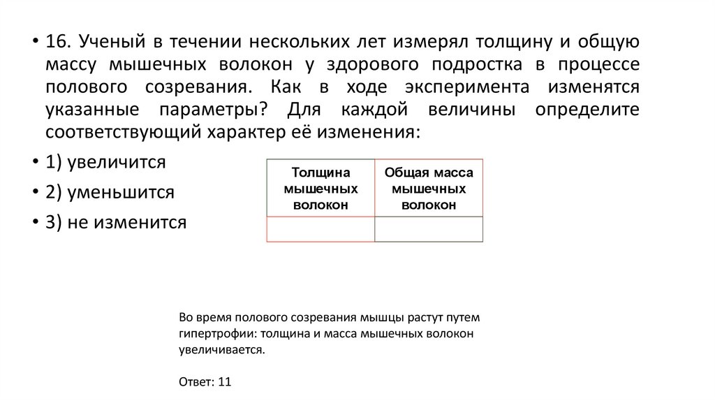 • 16. Ученый в течении нескольких лет измерял толщину и общуюмассу мышечных волокон у здорового подростка в процессе