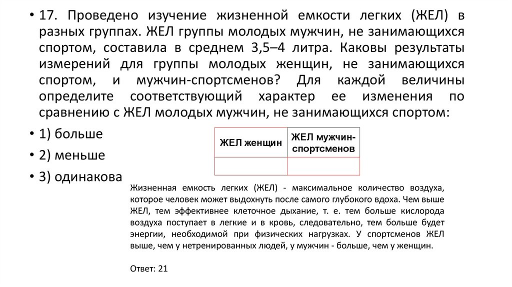 • 17. Проведено изучение жизненной емкости легких (ЖЕЛ) вразных группах. ЖЕЛ группы молодых мужчин, не занимающихся
