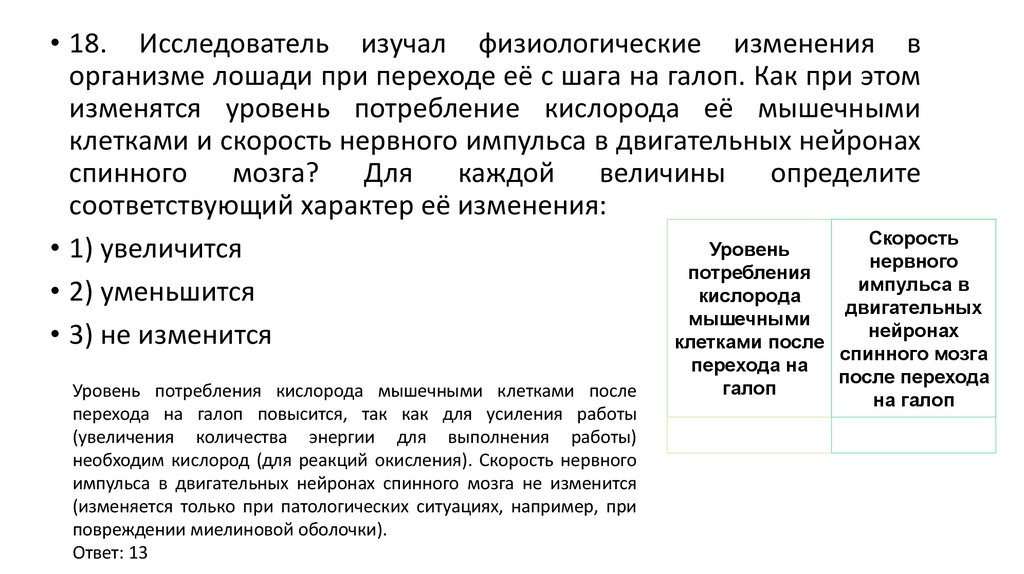 • 18. Исследователь изучал физиологические изменения ворганизме лошади при переходе её с шага на галоп. Как при этом