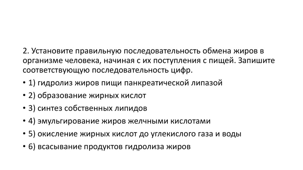 2. Установите правильную последовательность обмена жиров ворганизме человека, начиная с их поступления с пищей. Запишите