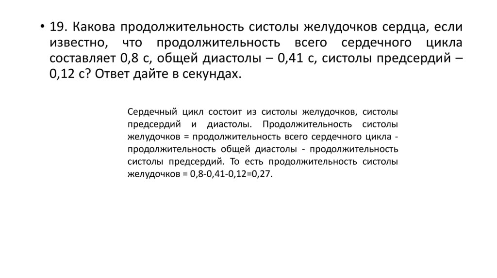 • 19. Какова продолжительность систолы желудочков сердца, еслиизвестно, что продолжительность всего сердечного цикла