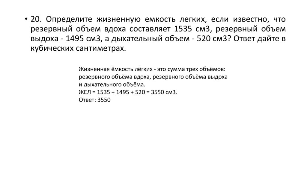 • 20. Определите жизненную емкость легких, если известно, чторезервный объем вдоха составляет 1535 см3, резервный объем
