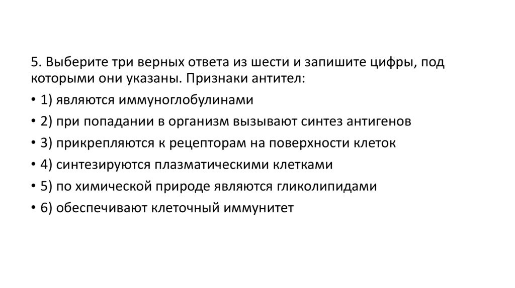 5. Выберите три верных ответа из шести и запишите цифры, подкоторыми они указаны. Признаки антител: