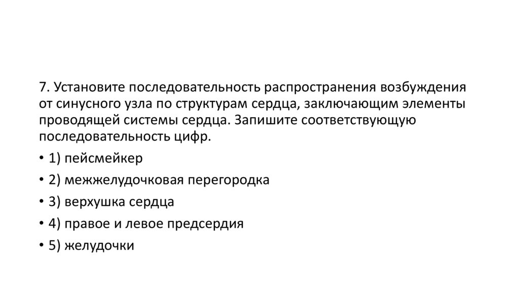 7. Установите последовательность распространения возбужденияот синусного узла по структурам сердца, заключающим элементы