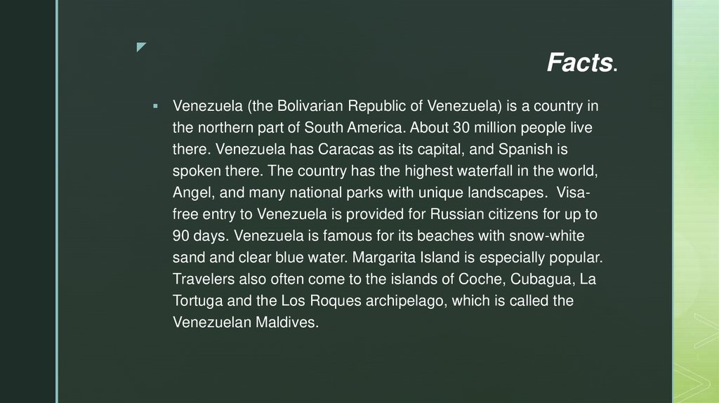 Angel, and many national parks with unique landscapes. Visafree entry to Venezuela is provided for Russian citizens for up to
