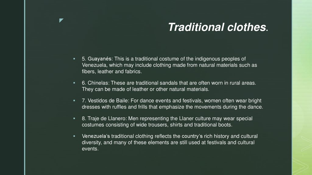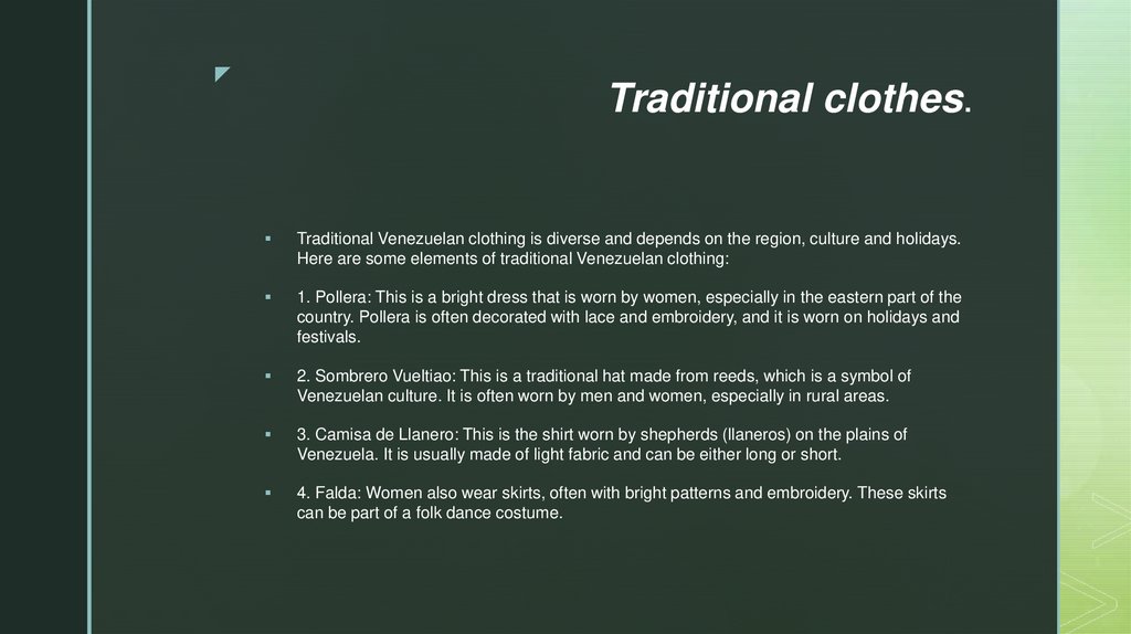 Traditional Venezuelan clothing is diverse and depends on the region, culture and holidays.