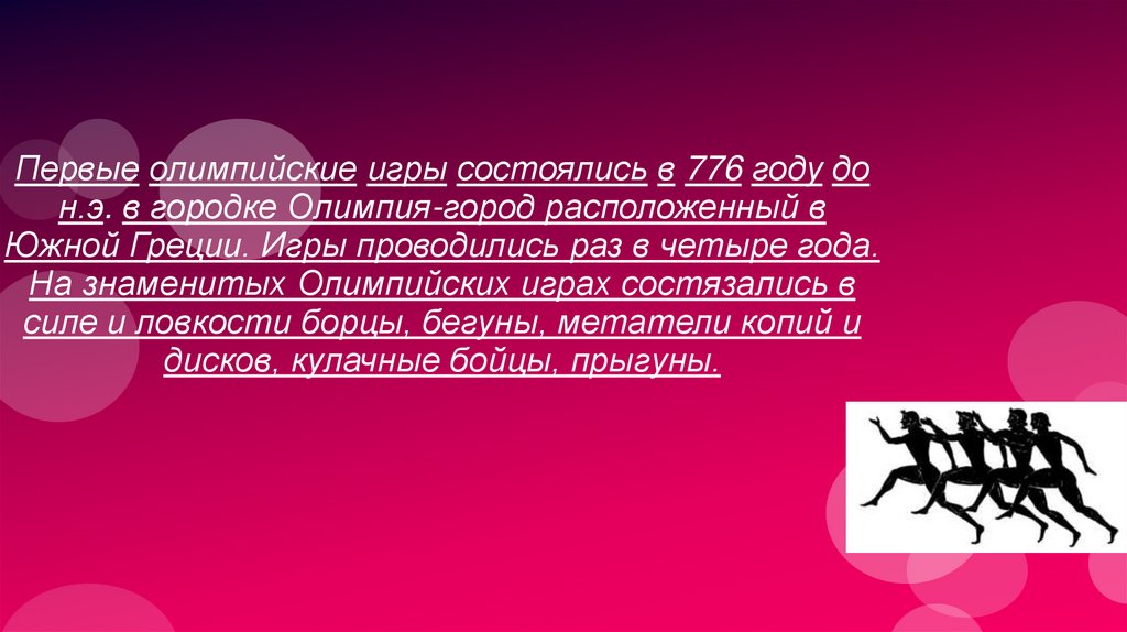 Первые олимпийские игры состоялись в 776 году дон.э. в городке Олимпия-город расположенный в