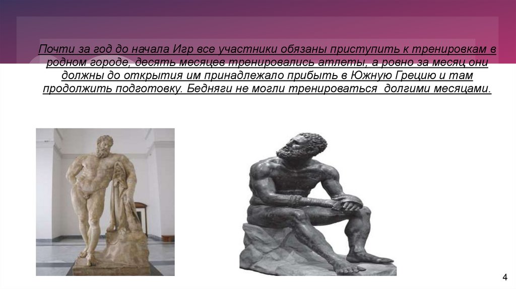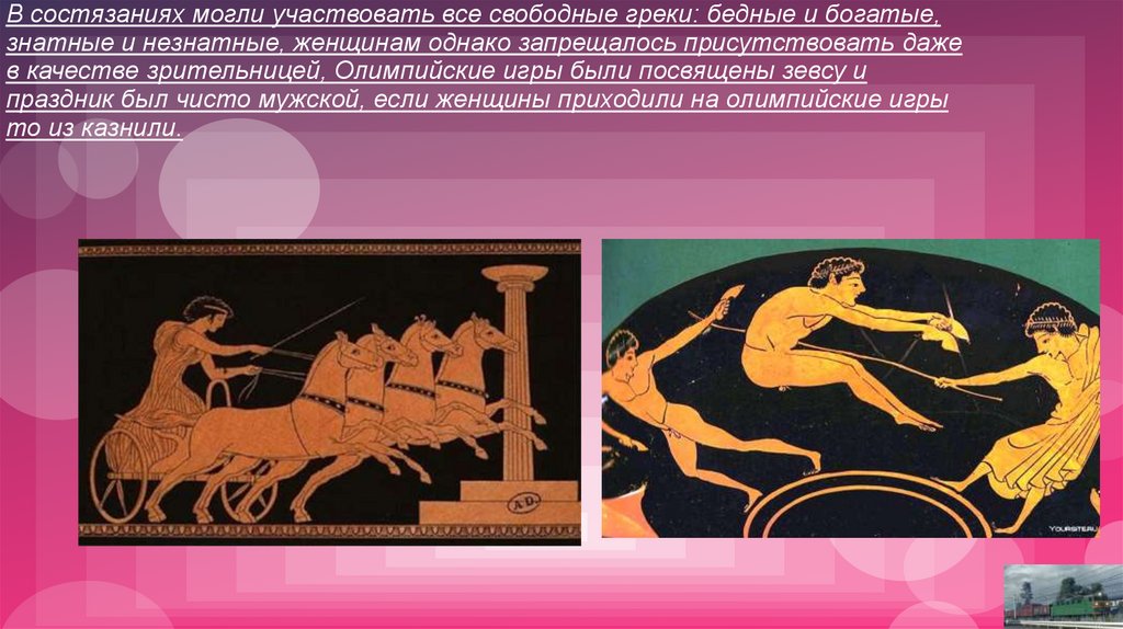В состязаниях могли участвовать все свободные греки: бедные и богатые,знатные и незнатные, женщинам однако запрещалось присутствовать даже