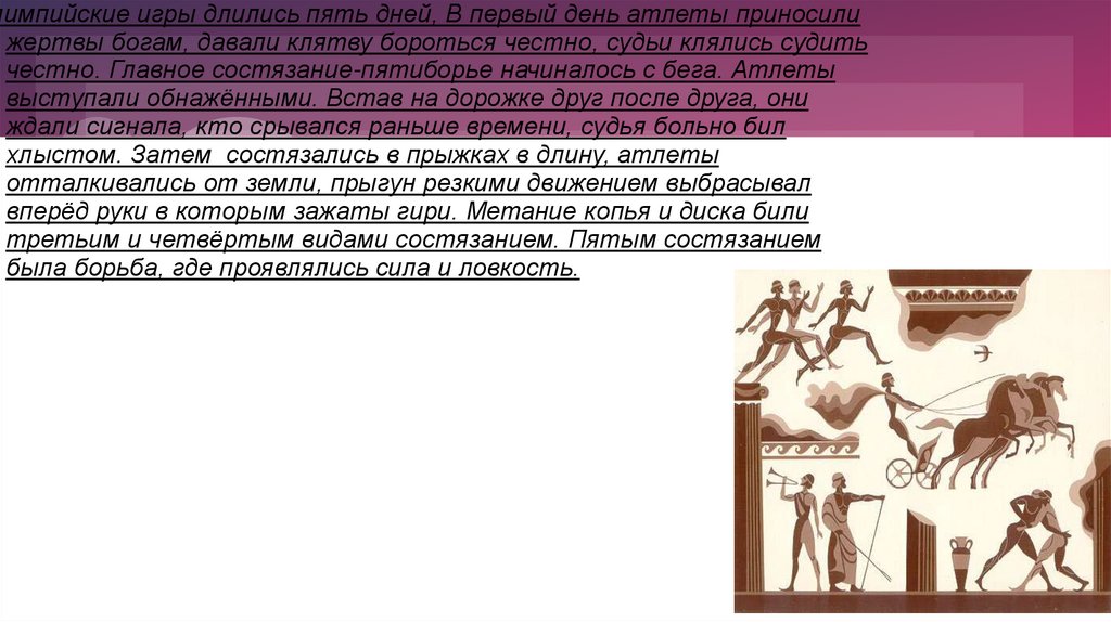 лимпийские игры длились пять дней, В первый день атлеты приносилижертвы богам, давали клятву бороться честно, судьи клялись судить