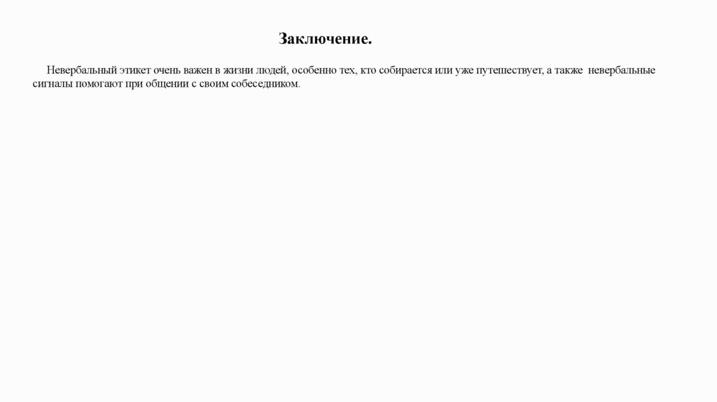 Заключение.Невербальный этикет очень важен в жизни людей, особенно тех, кто собирается или уже путешествует, а также невербальные