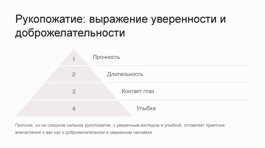Прочное, но не слишком сильное рукопожатие, с уверенным взглядом и улыбкой, оставляет приятное