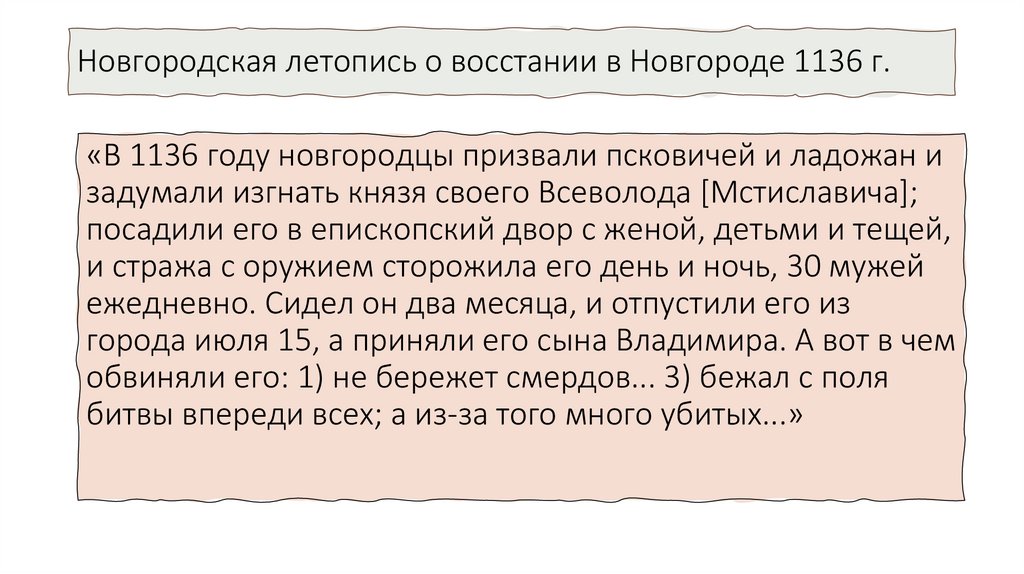 Новгородская летопись о восстании в Новгороде 1136 г.«В 1136 году новгородцы призвали псковичей и ладожан и