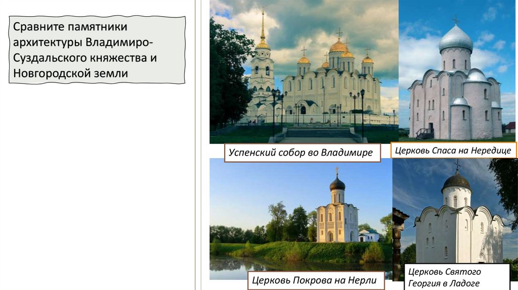 Сравните памятникиархитектуры ВладимироСуздальского княжества и