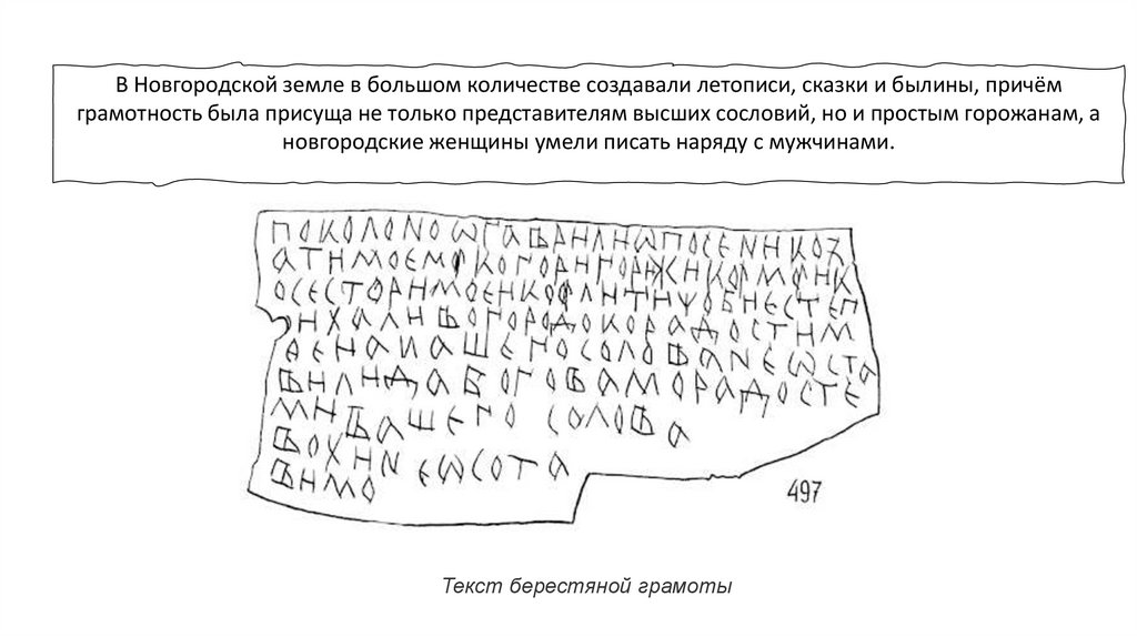В Новгородской земле в большом количестве создавали летописи, сказки и былины, причёмграмотность была присуща не только представителям высших сословий, но и простым горожанам, а