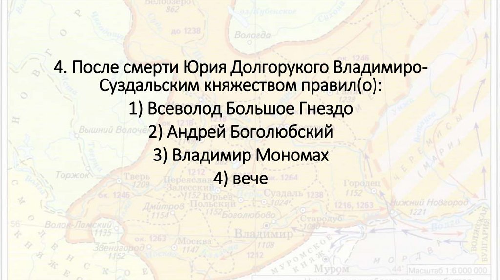4. После смерти Юрия Долгорукого ВладимироСуздальским княжеством правил(о):1) Всеволод Большое Гнездо