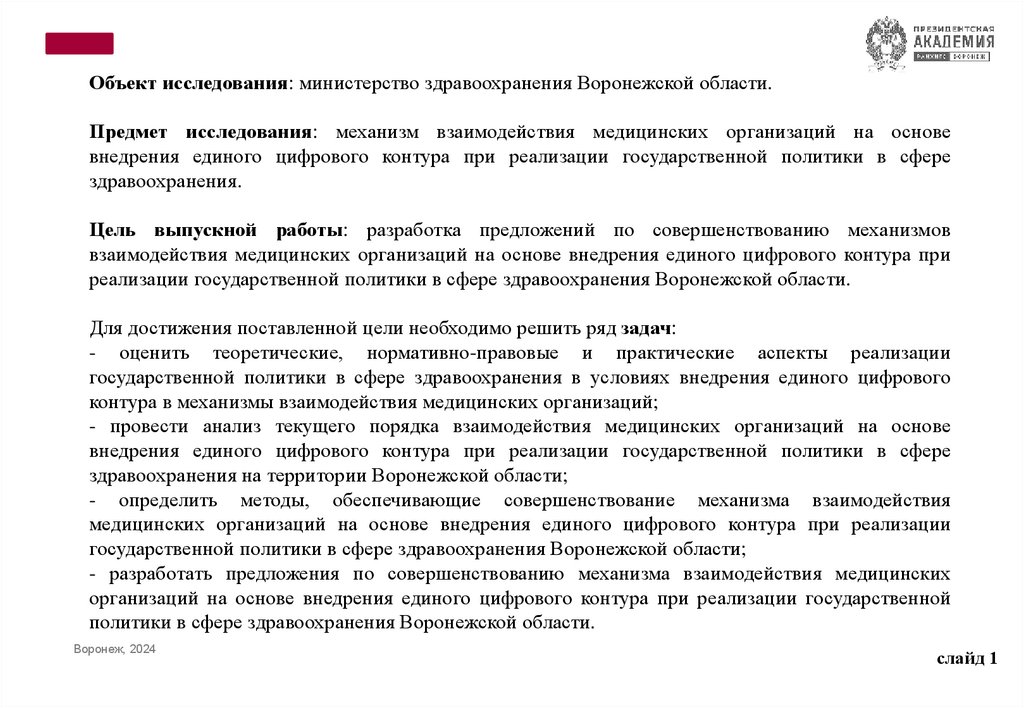 Объект исследования: министерство здравоохранения Воронежской области.Предмет исследования: механизм взаимодействия медицинских организаций на основе