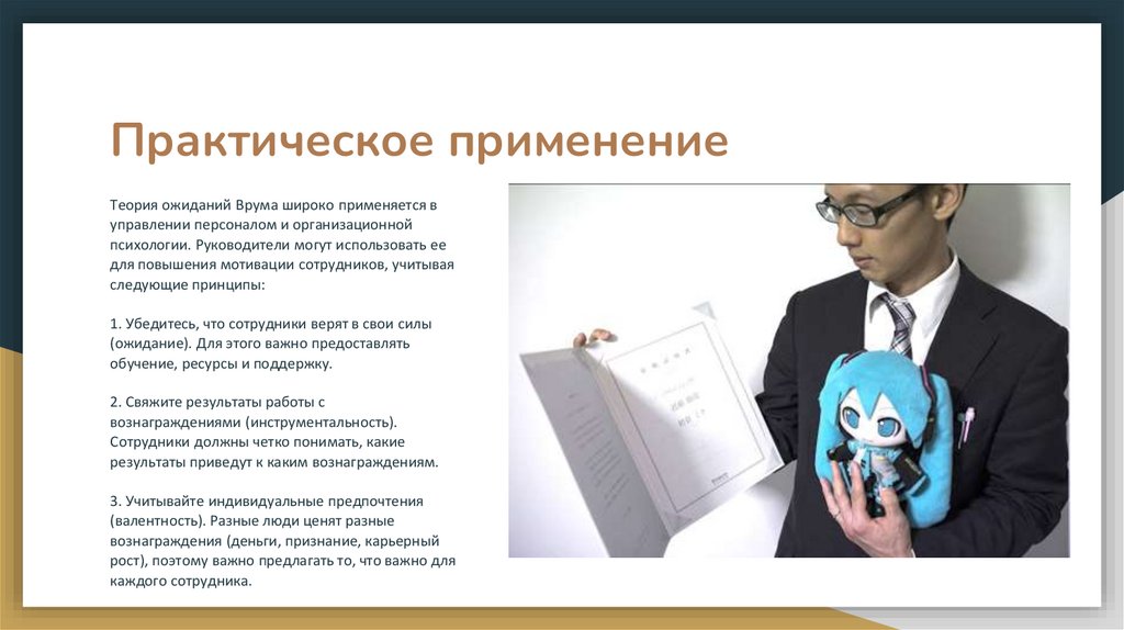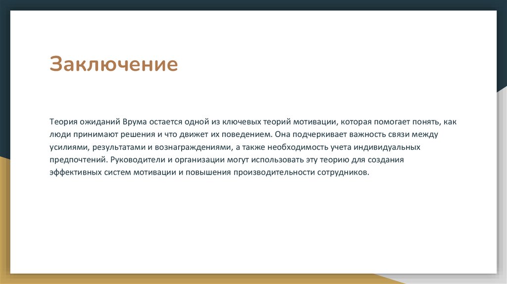 ЗаключениеТеория ожиданий Врума остается одной из ключевых теорий мотивации, которая помогает понять, как