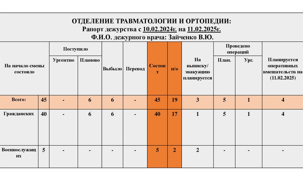 Отделение травматологии и ортопедии. Рапорт дежурства