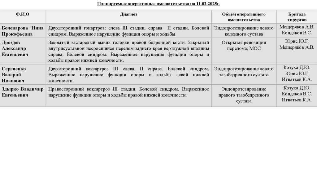 Планируемые оперативные вмешательства на 11.02.2025г.Ф.И.О