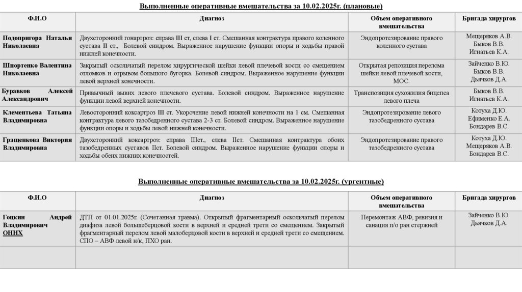 Выполненные оперативные вмешательства за 10.02.2025г. (плановые)Ф.И.О