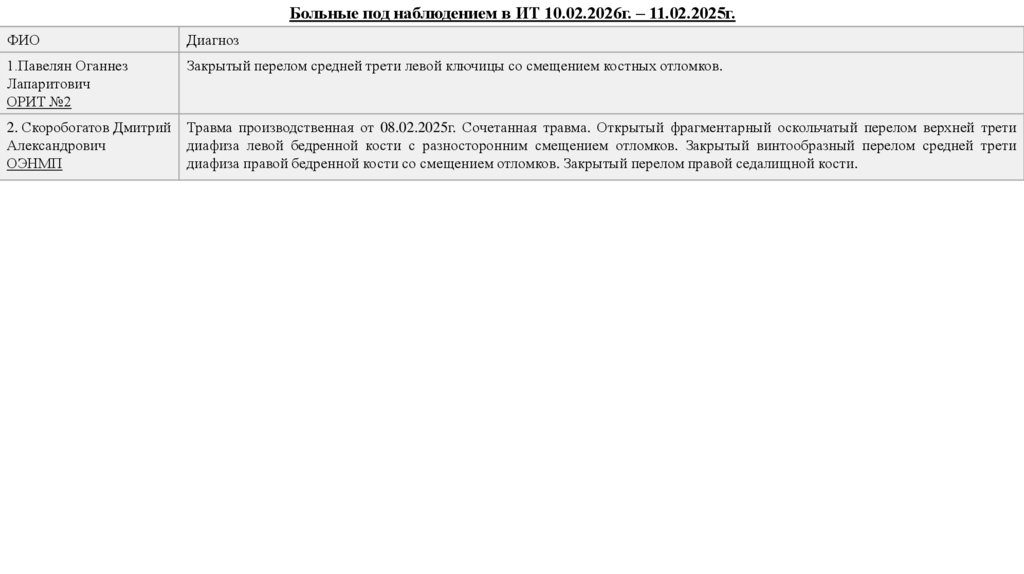 ОТДЕЛЕНИЕ ТРАВМАТОЛОГИИ И ОРТОПЕДИИ:Рапорт дежурства с 10.02.2024г. на 11.02.2025г.
