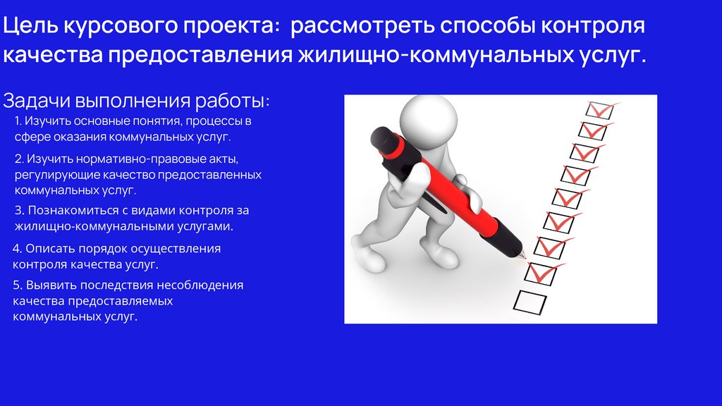Цель курсового проекта: рассмотреть способы контролякачества предоставления жилищно-коммунальных услуг.