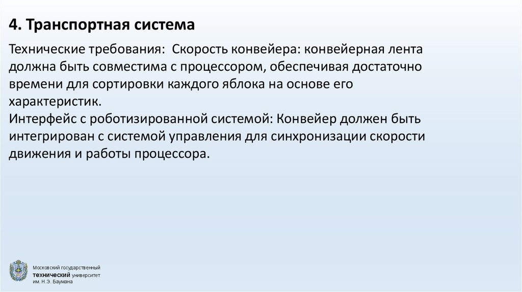 4. Транспортная системаТехнические требования: Скорость конвейера: конвейерная лента