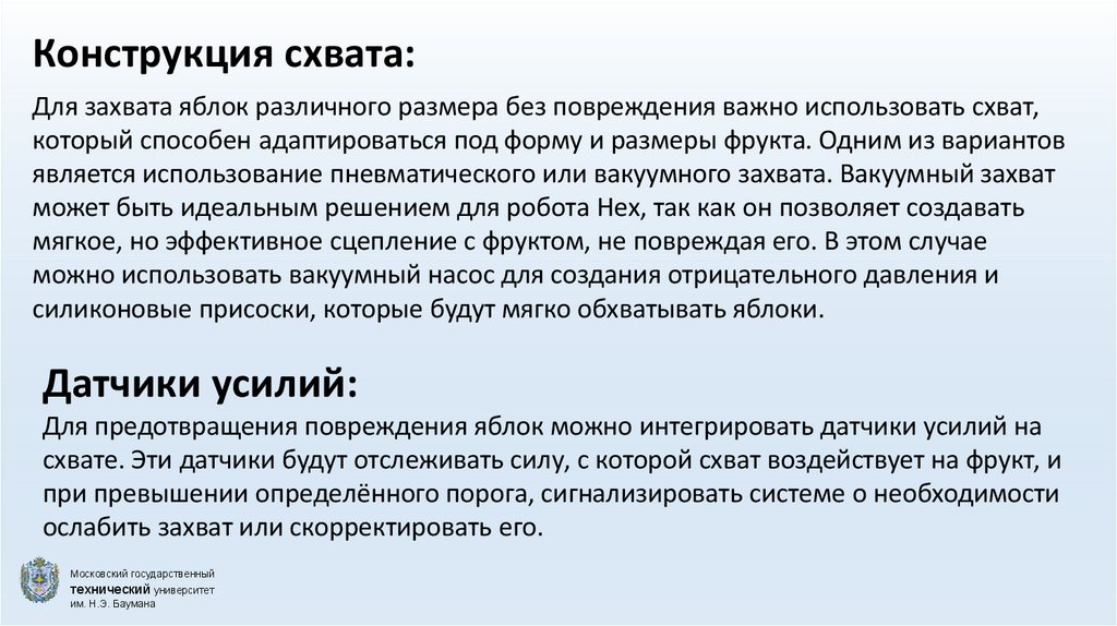 Конструкция схвата:Для захвата яблок различного размера без повреждения важно использовать схват,