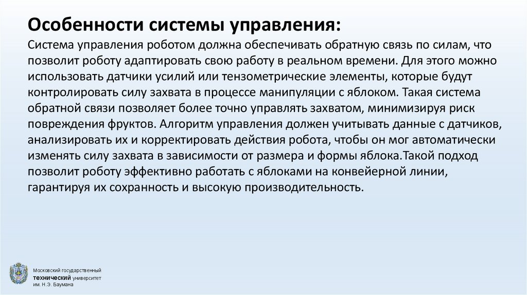 Особенности системы управления:Система управления роботом должна обеспечивать обратную связь по силам, что