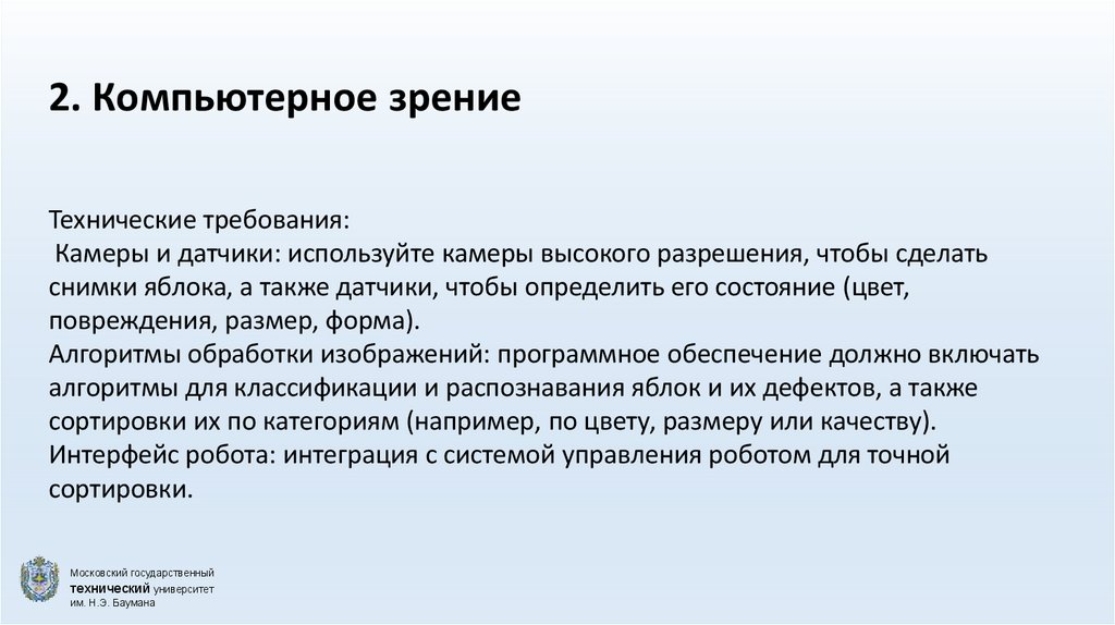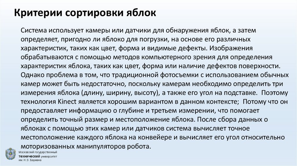 Критерии сортировки яблокСистема использует камеры или датчики для обнаружения яблок, а затем